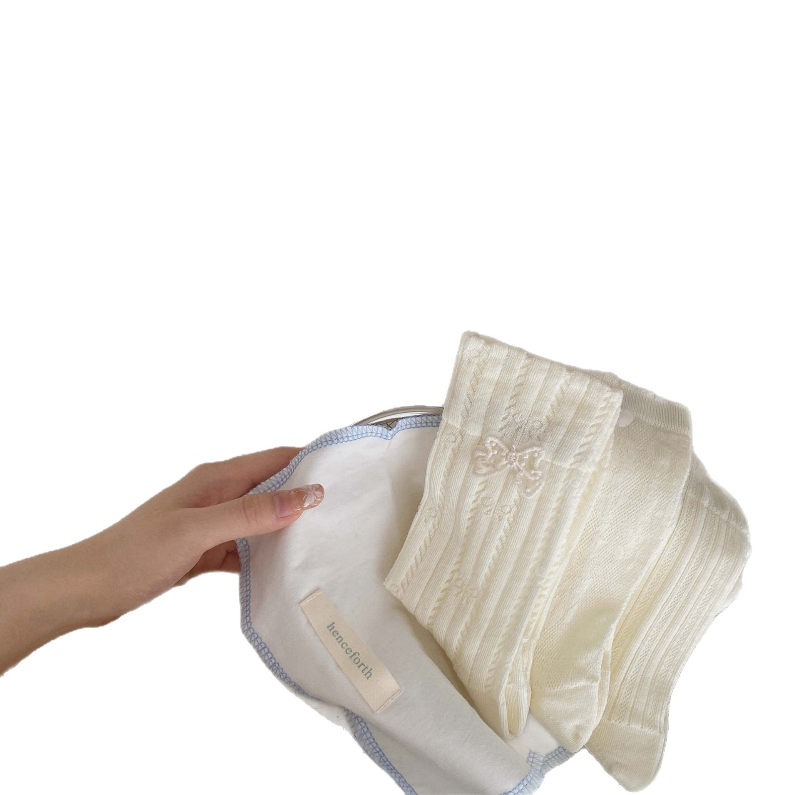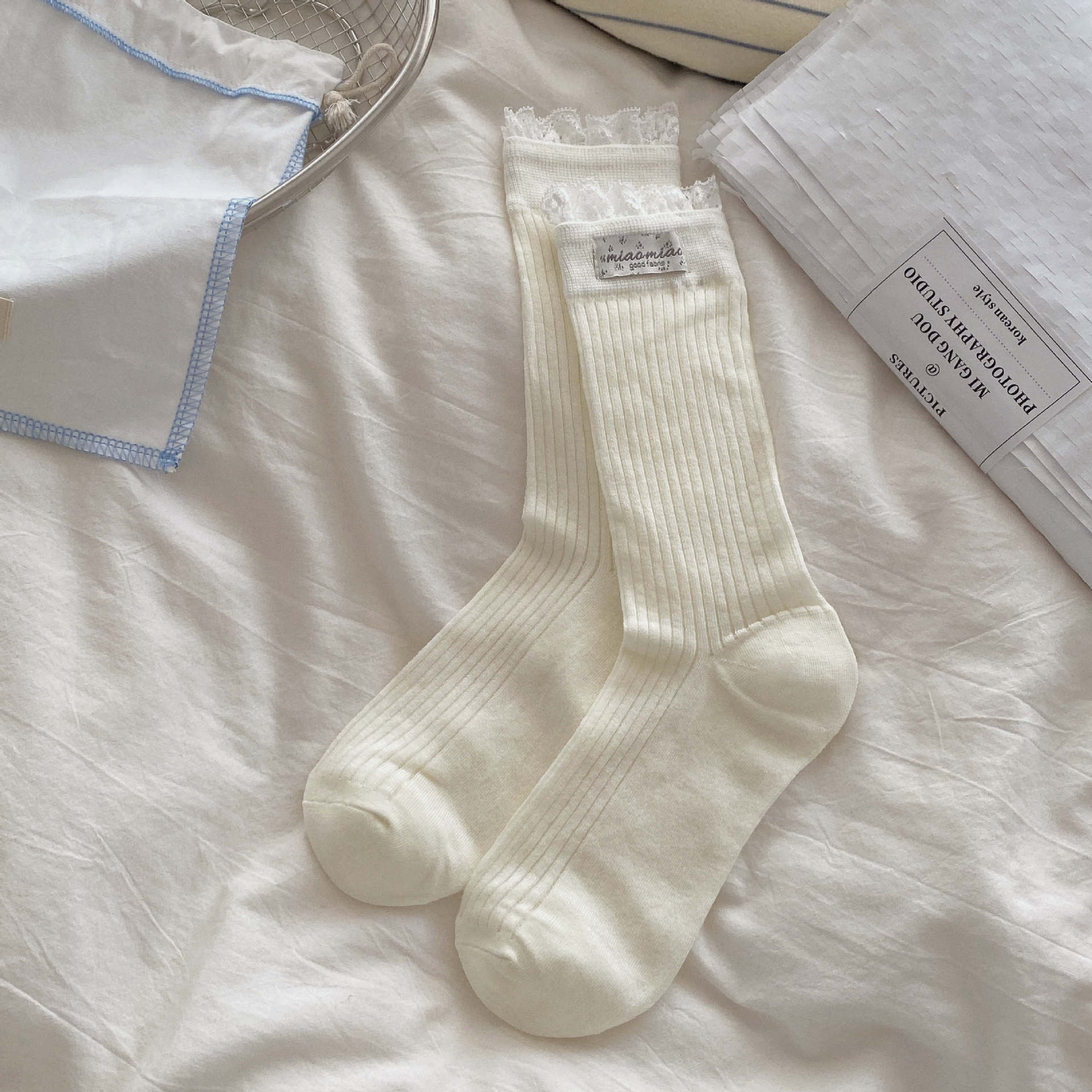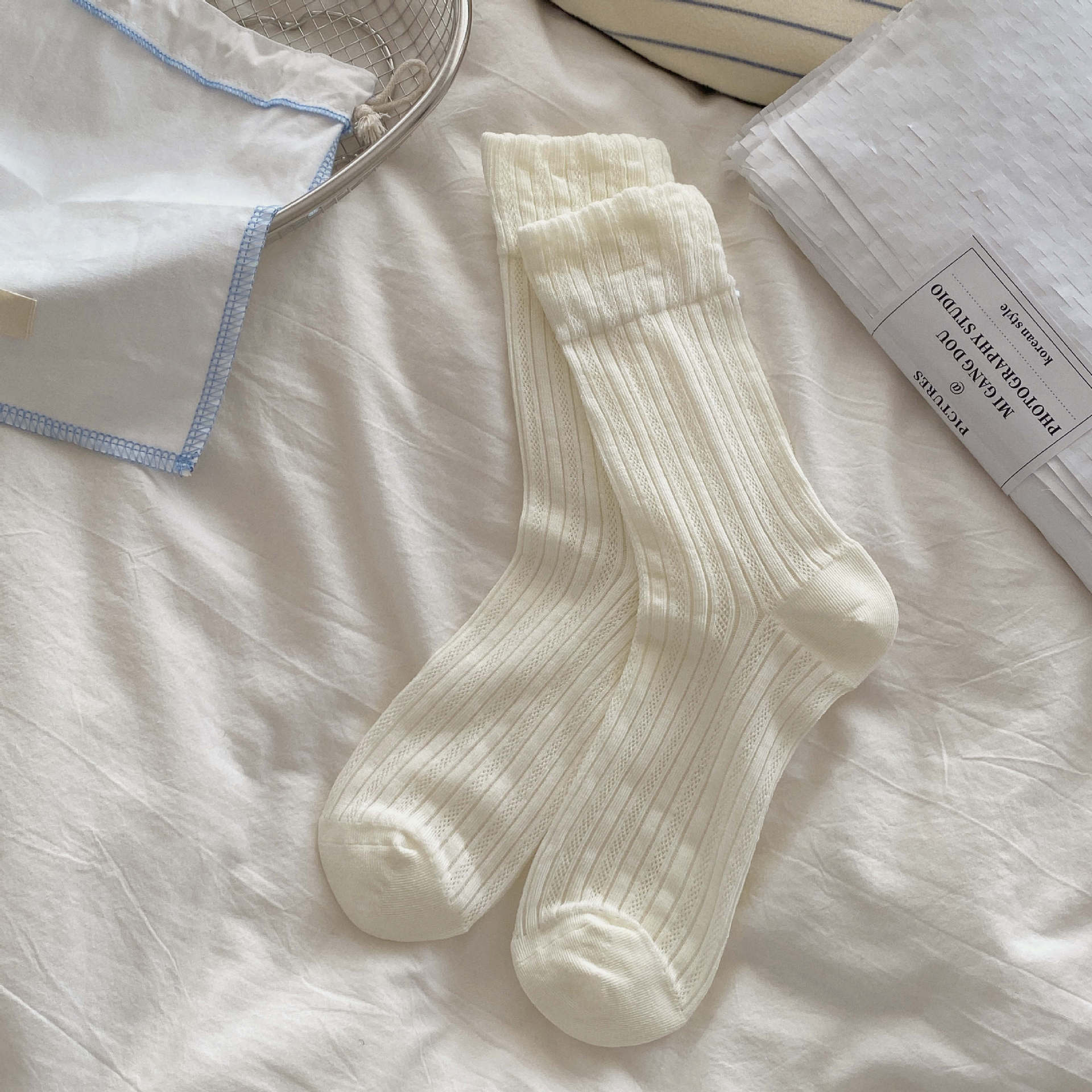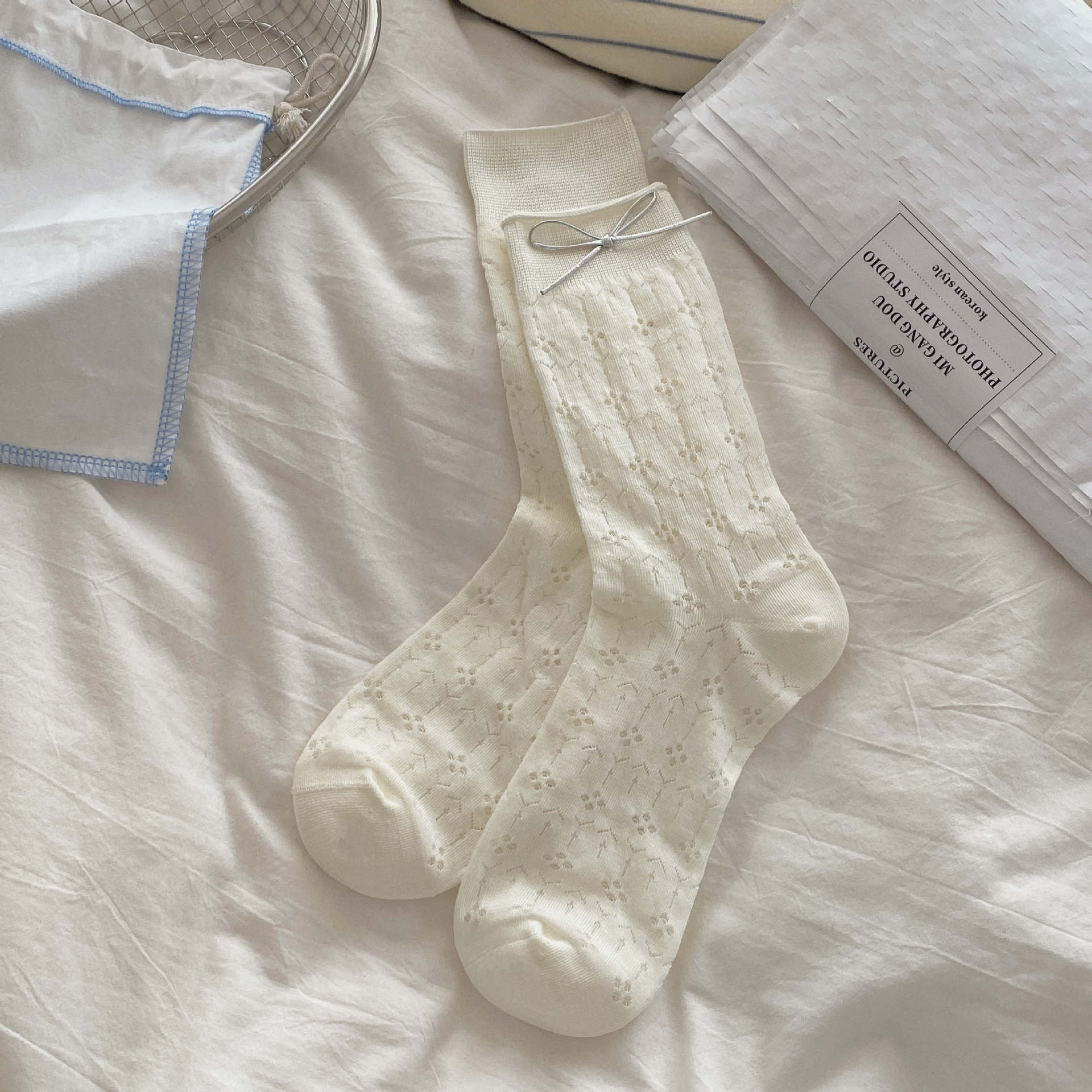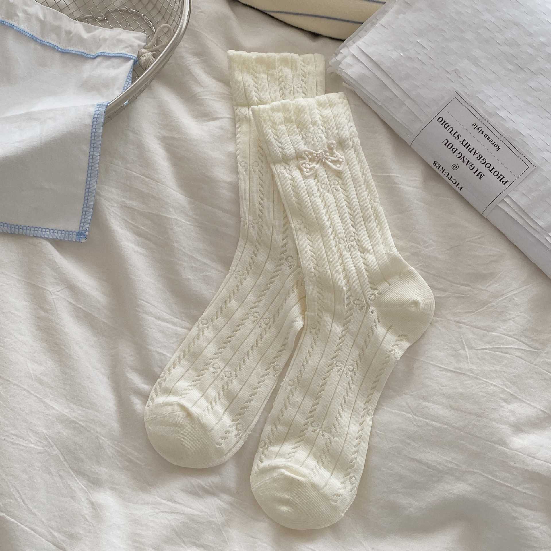 直播间奶油色袜子女春夏季薄款镂空夏中筒袜菱格碎花学院风堆堆袜
