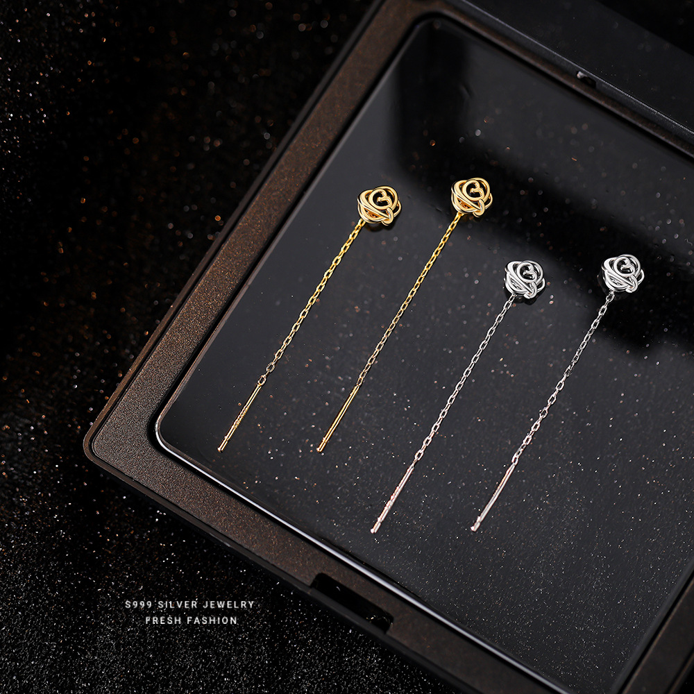 s999足银镂空玫瑰花流苏耳坠女轻奢优雅法式复古耳线耳环花朵耳饰