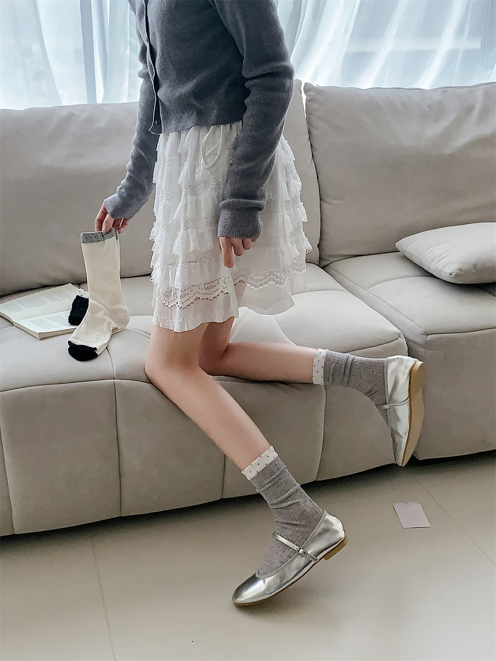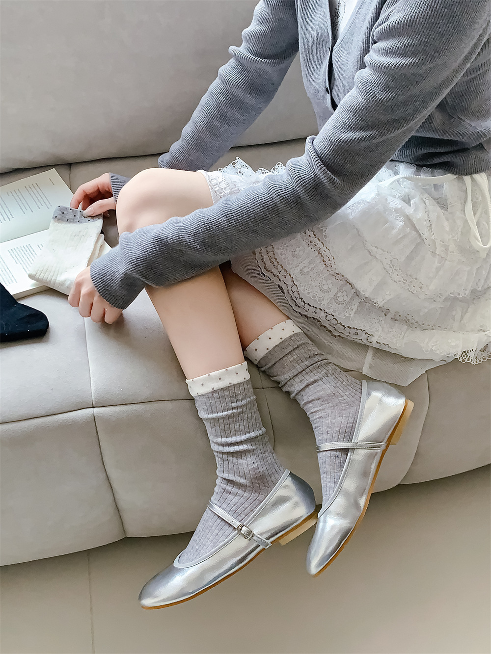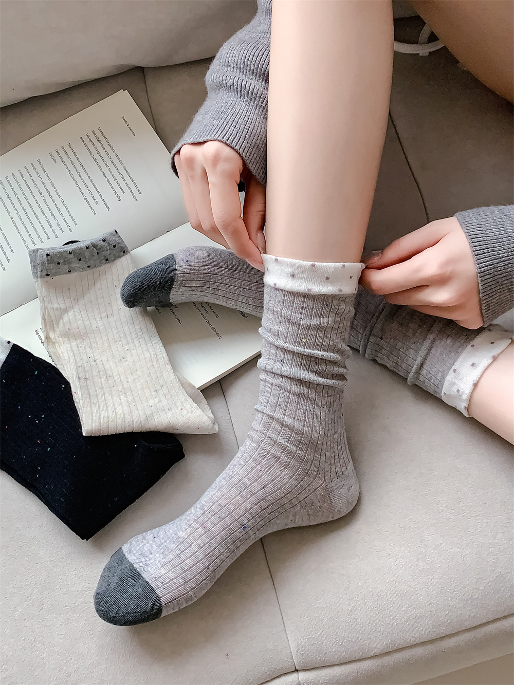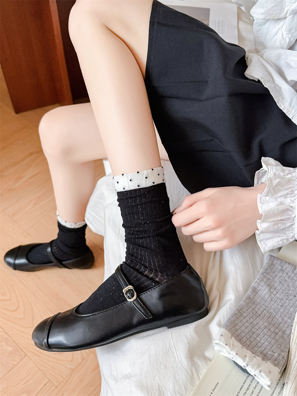 春夏季日系薄款点子纱女中筒堆堆wa~简约百搭黑色均码灰色白色棉