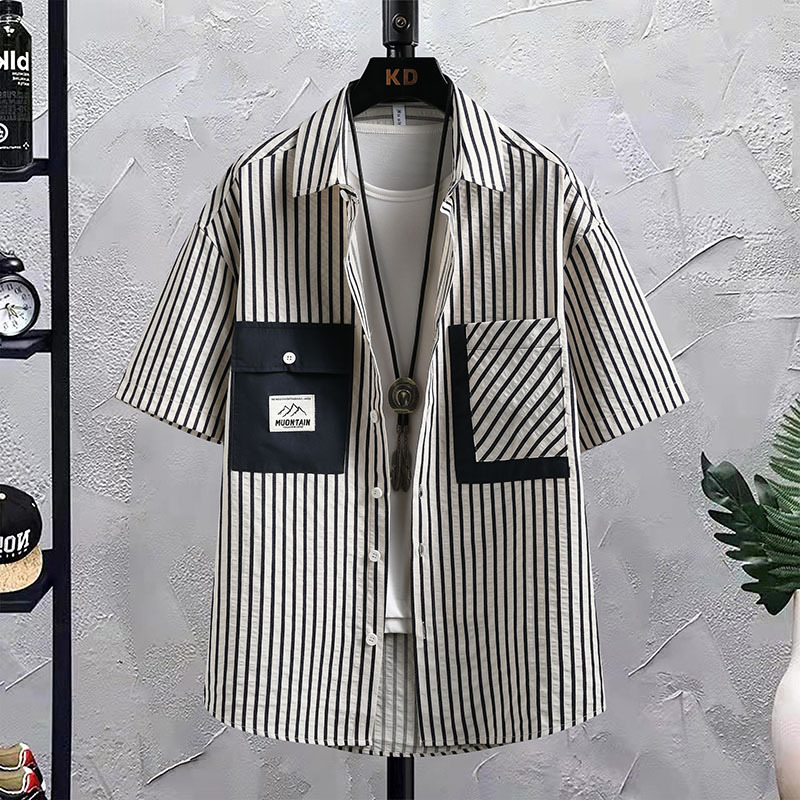 港风潮牌春夏季新品男士休闲百搭透气轻薄条纹衬衫半袖痞帅男