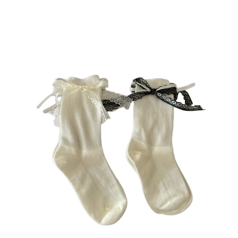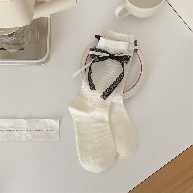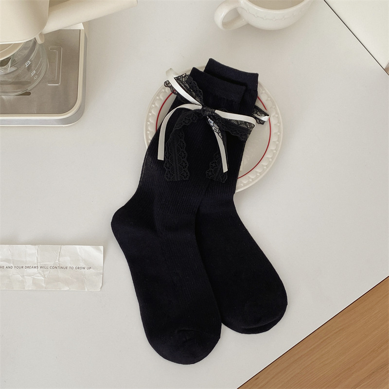 蕾丝蝴蝶结花边袜子女春夏薄款条纹芭蕾风中筒袜日系可爱jk洛丽塔