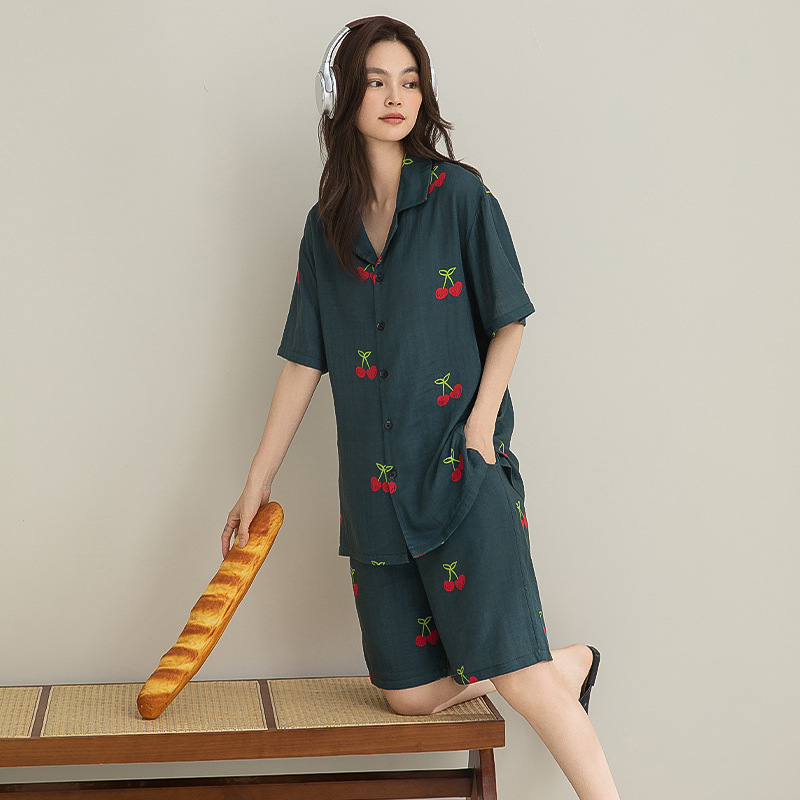 新款简约休闲满印车厘子短袖A类纯棉睡衣女夏套装开衫翻领家居服