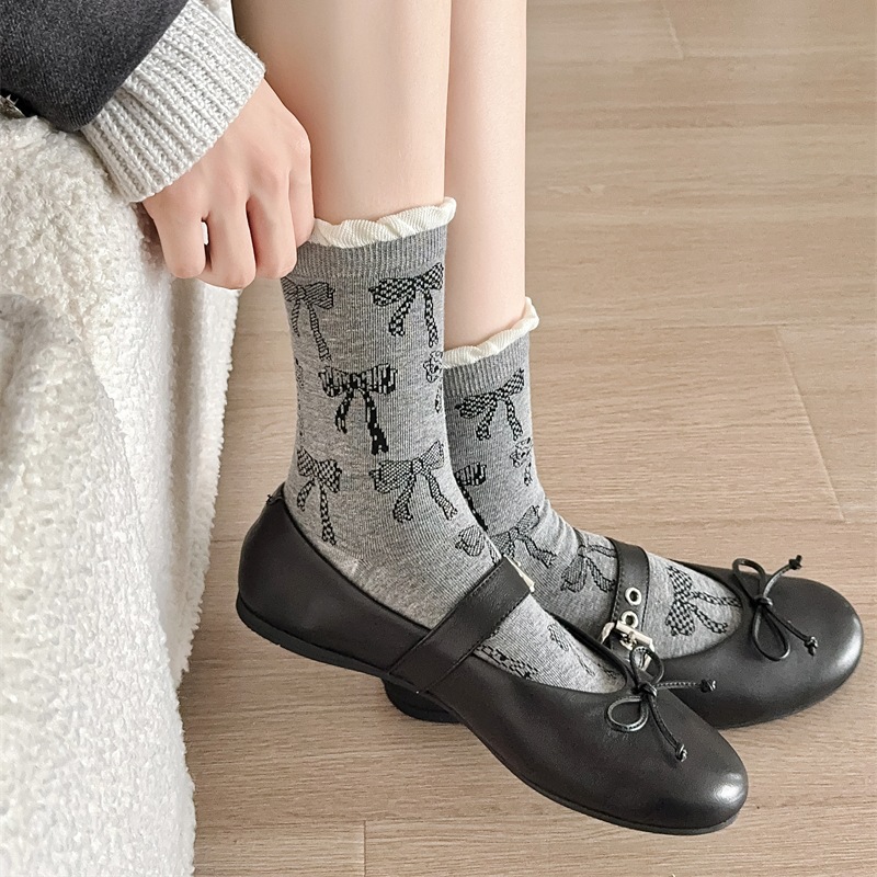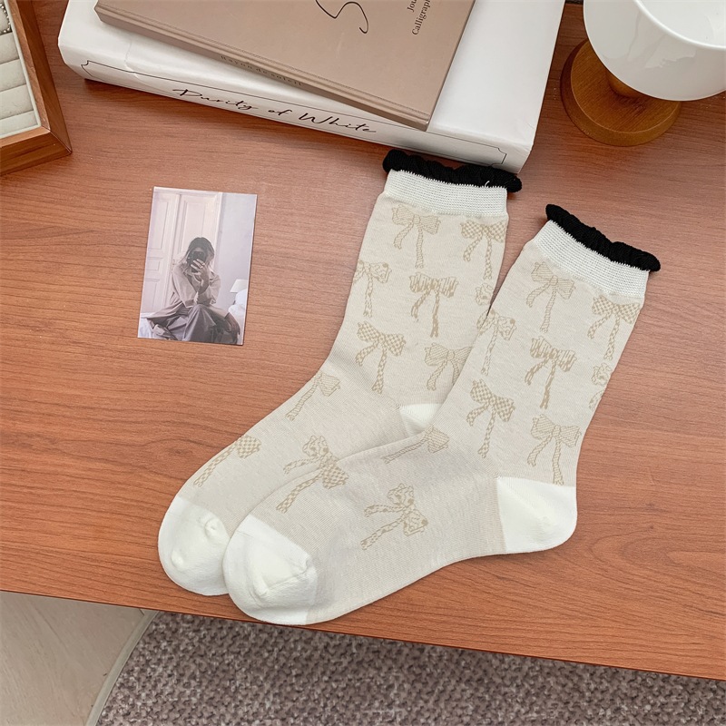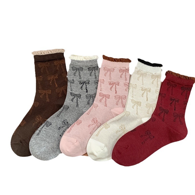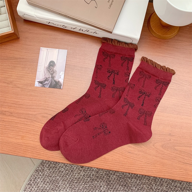 复古玫瑰色'韩系ins满身蝴蝶结中筒袜子女撞色罗口泡泡边堆堆袜