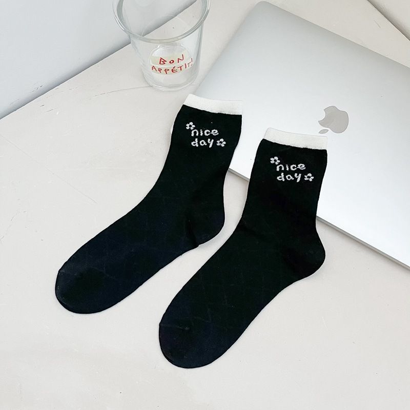 日系春夏黑白纯色花朵清新男女袜子可爱ins中筒甜美