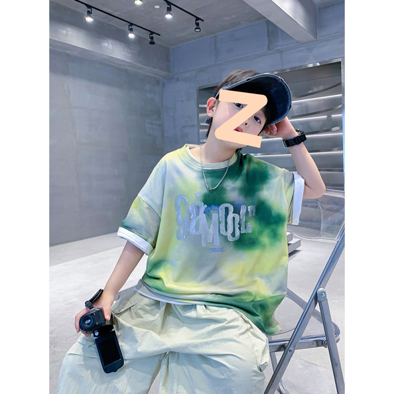 男大童夏季扎染冰丝短袖t恤新款儿童男孩夏装痞帅宽松上衣潮T