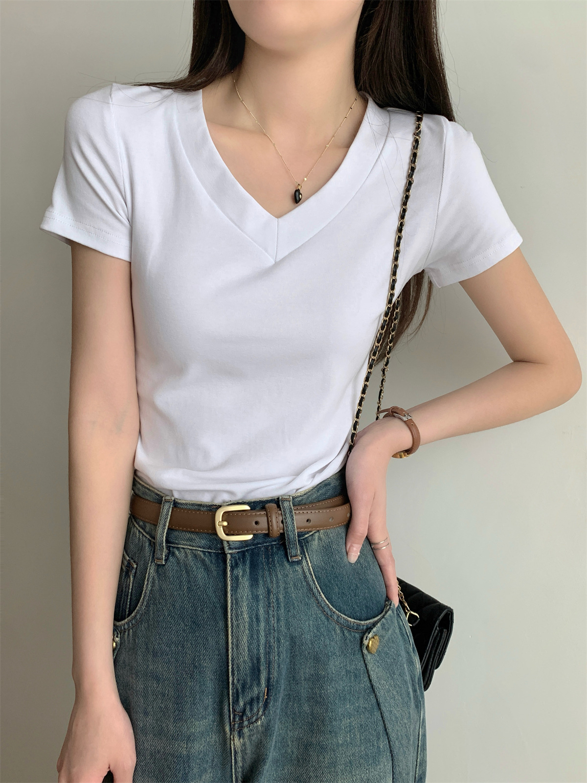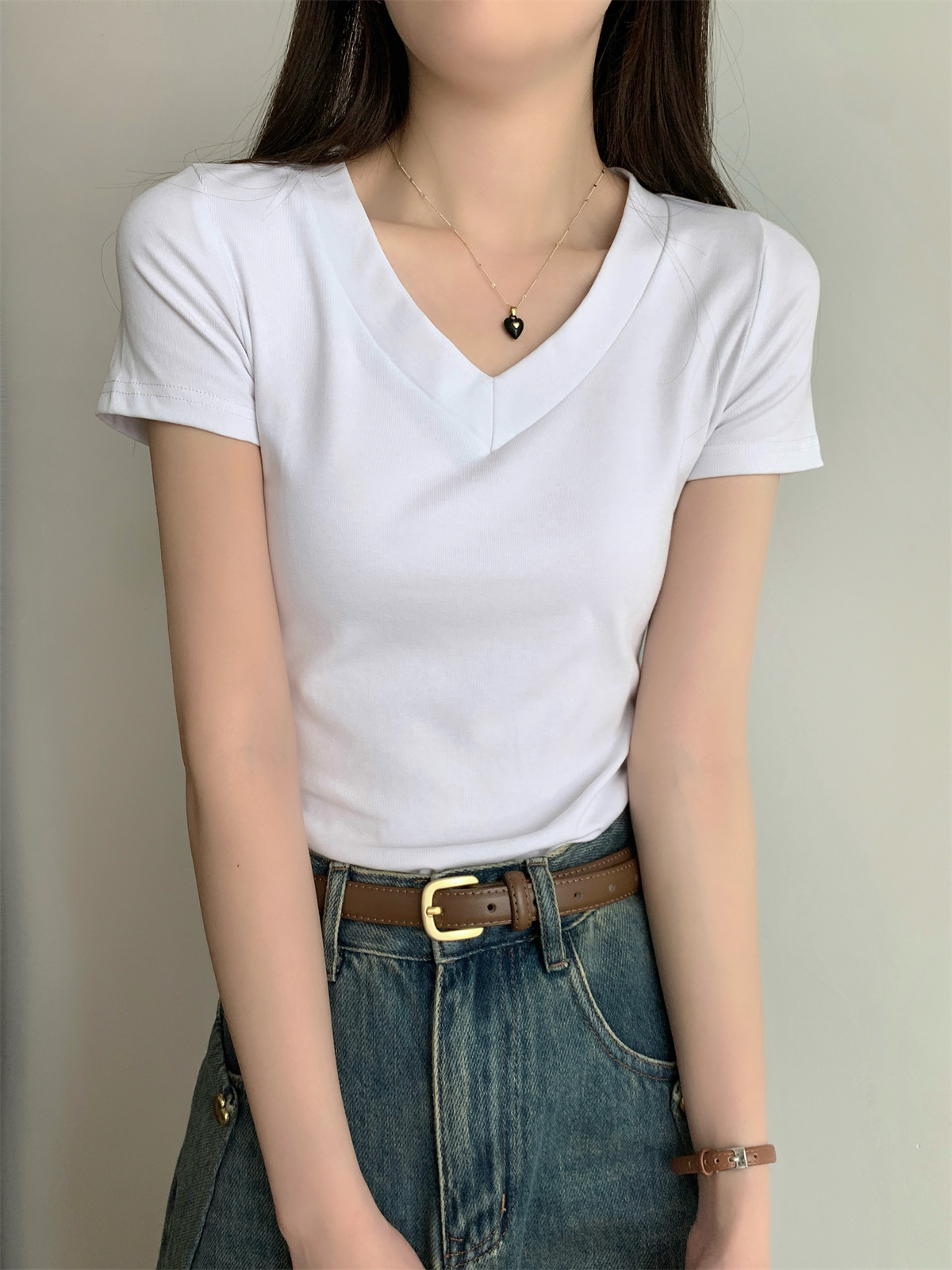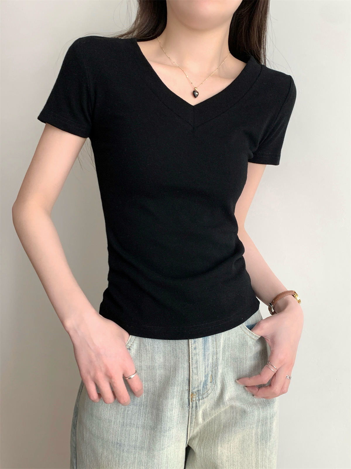 简约纯色V领正肩短袖T恤女装夏季新款修身显瘦基础款学生上衣