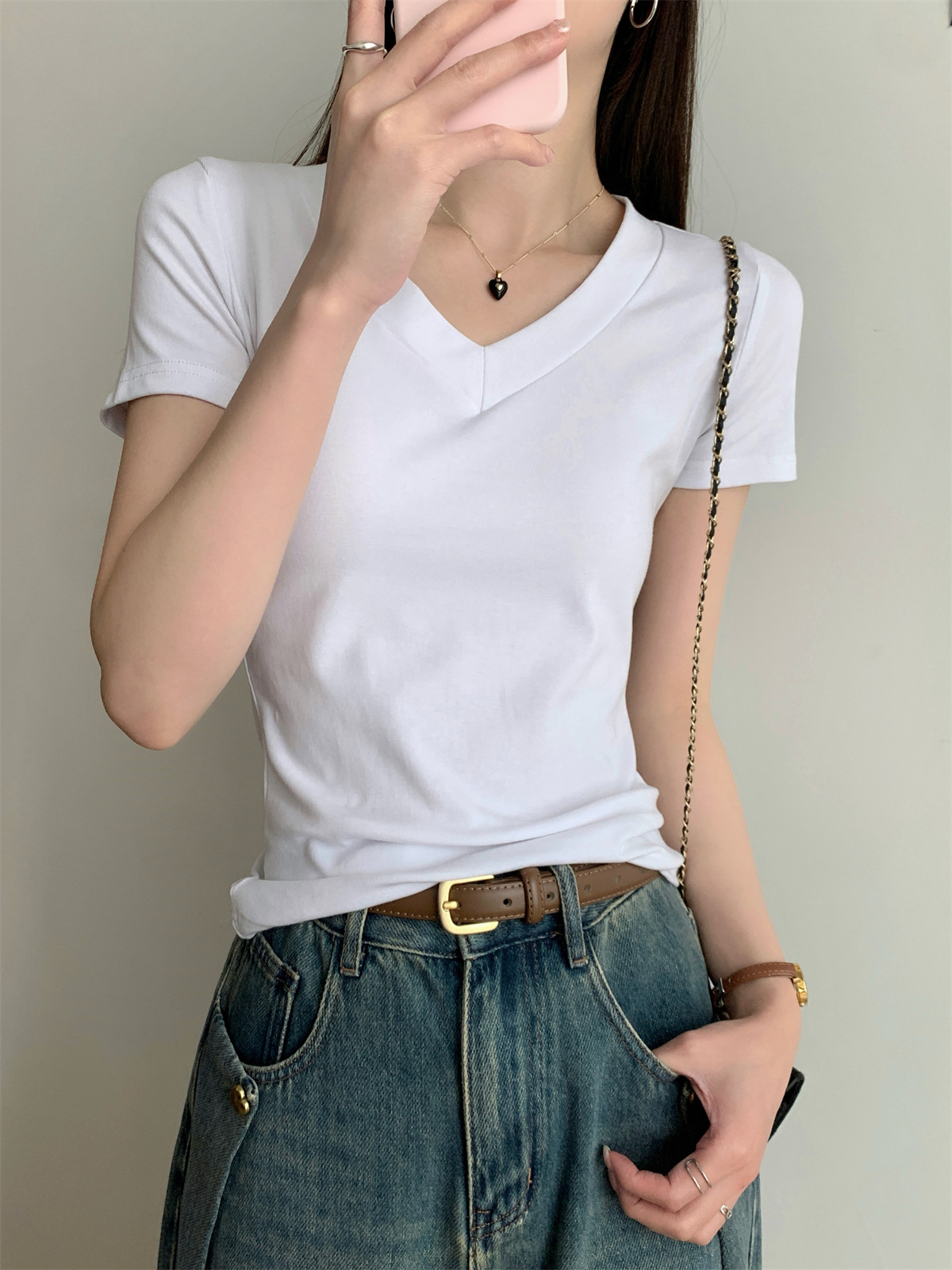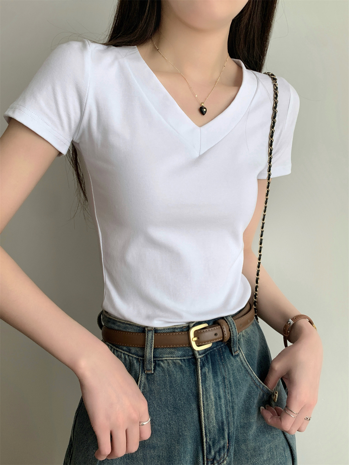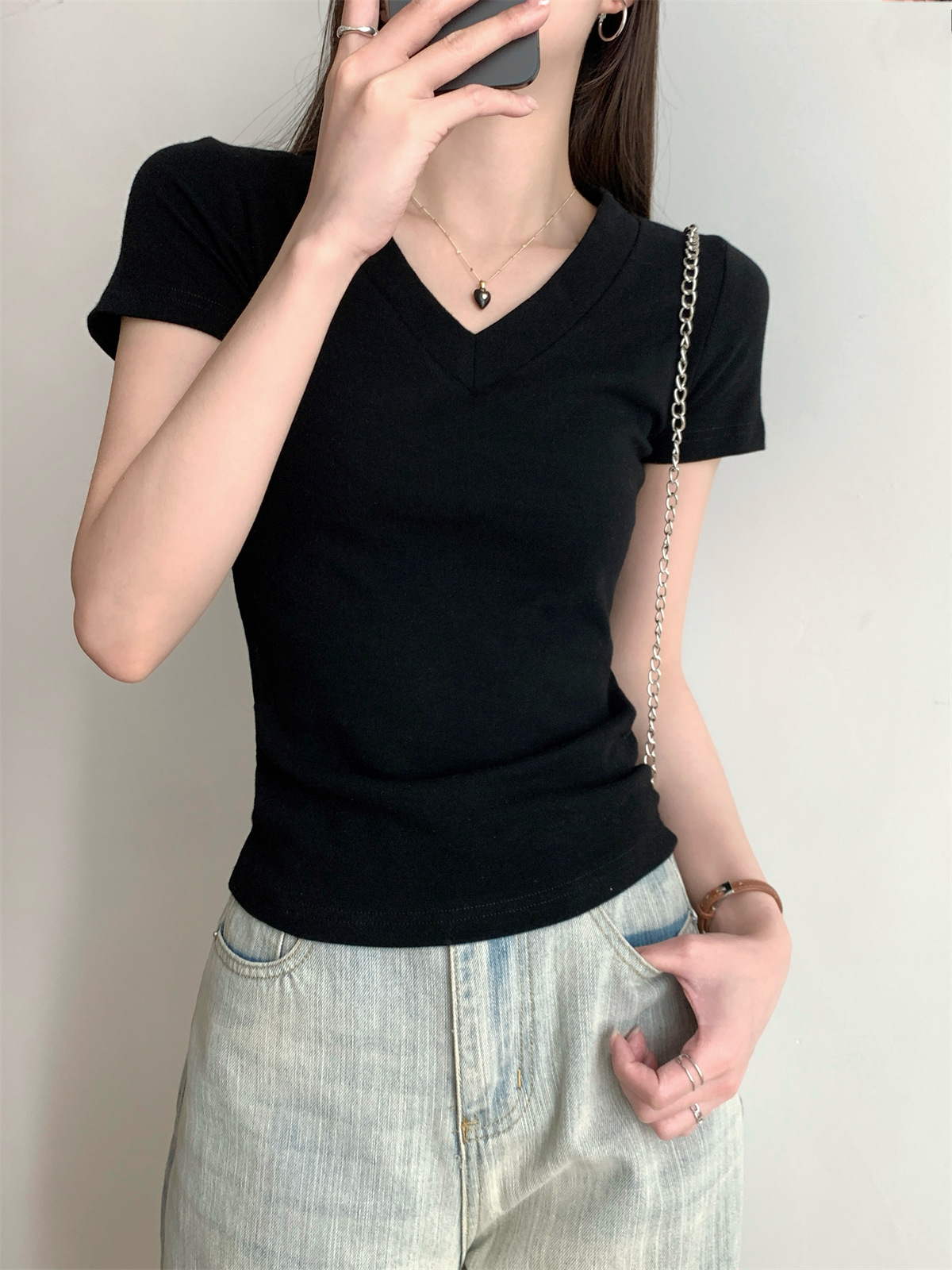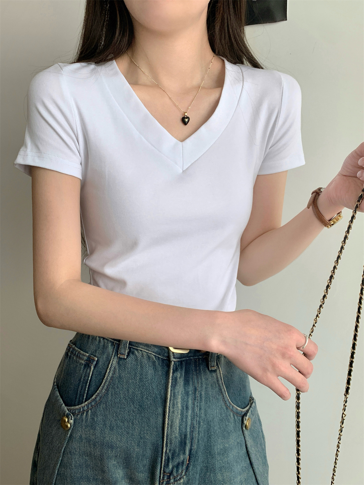 简约纯色V领正肩短袖T恤女装夏季新款修身显瘦基础款学生上衣