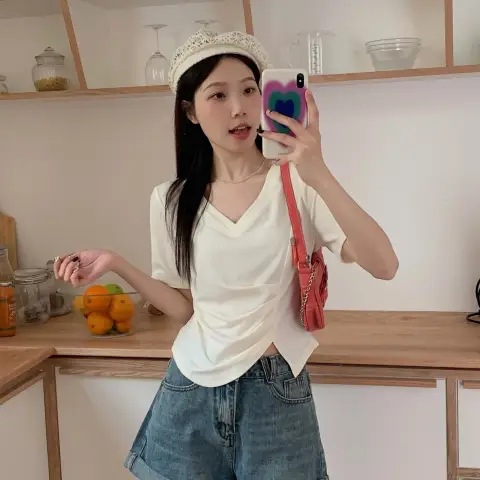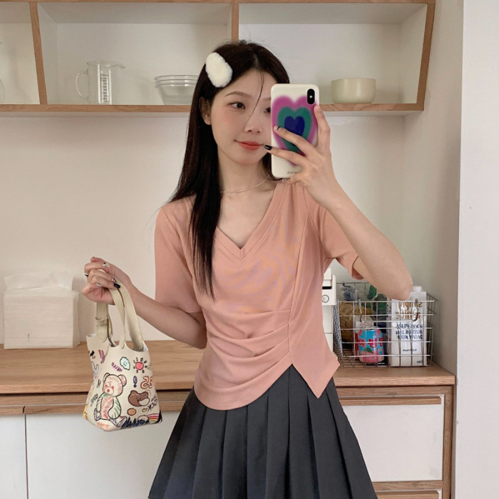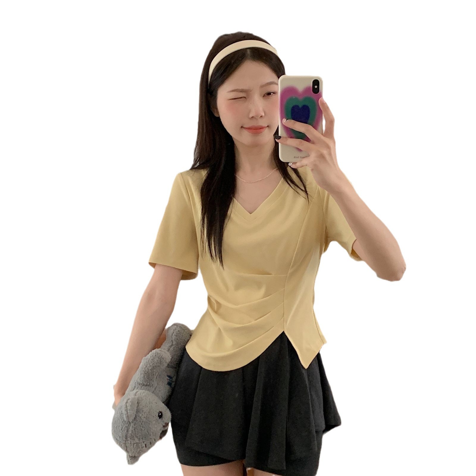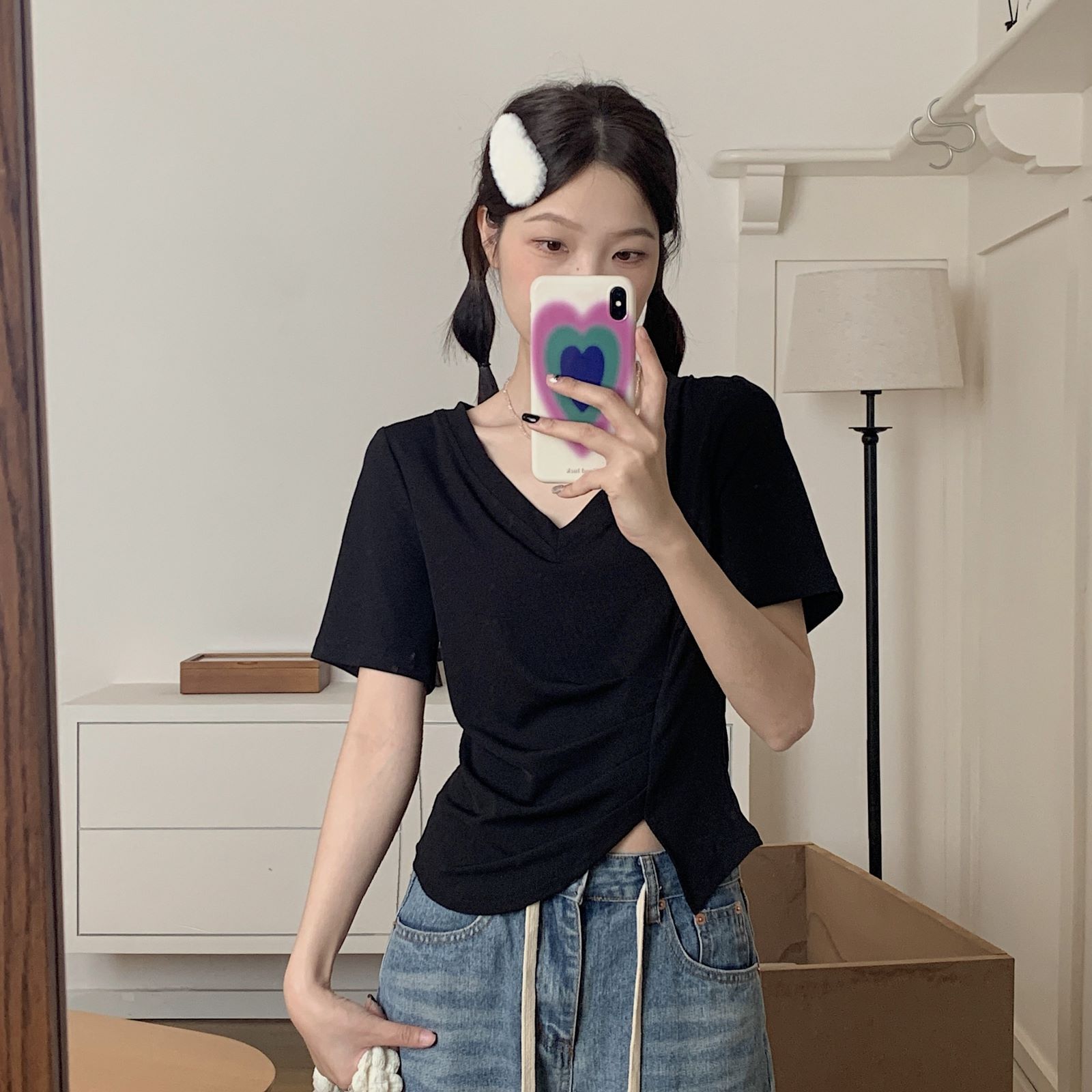 女装不规则V领开叉短袖T恤女夏季新款褶肚学生短款上衣打底衫