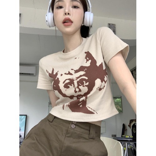 美式复古印花短袖t恤女夏季新款辣妹短款修身露脐学生上衣女
