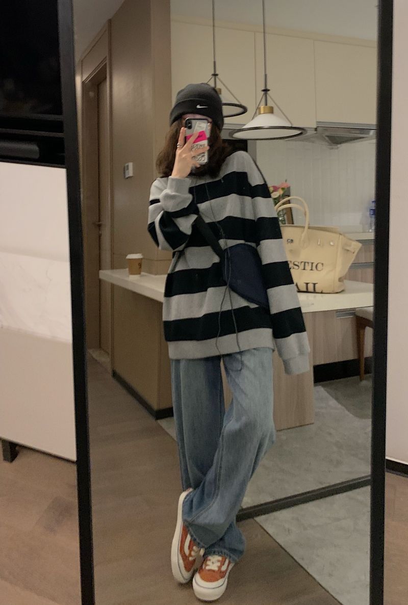 复古条纹卫衣女新款秋装薄款ins宽松韩版长袖圆领套头上衣潮