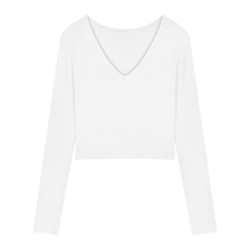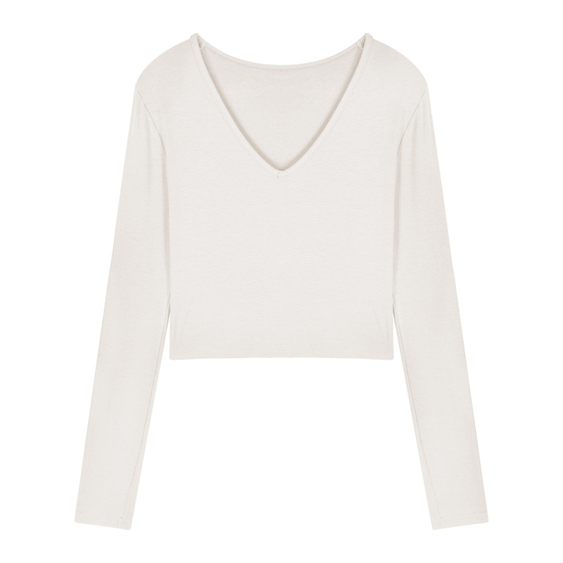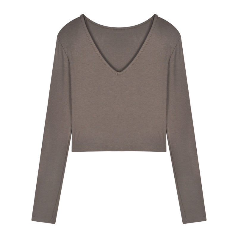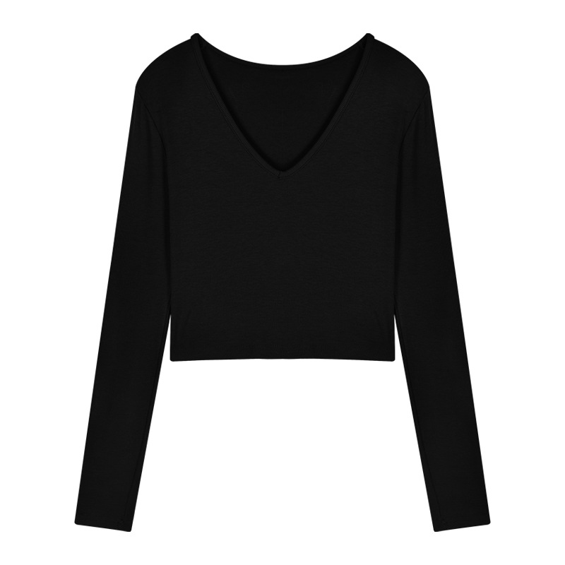 6803#T恤女短款紧身长袖内搭打底衫2022秋季新款性感v领锁骨上衣