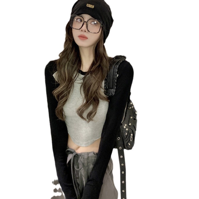 美式不规则短款T恤女装秋季新款辣妹长袖修身内搭打底衫上衣