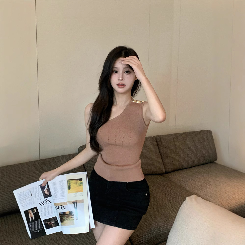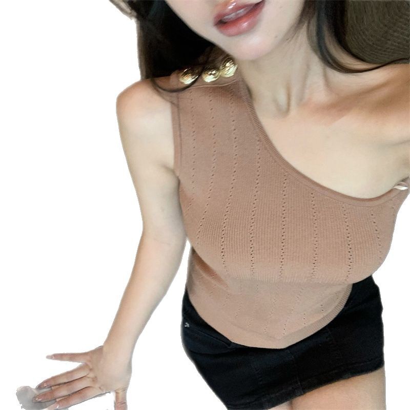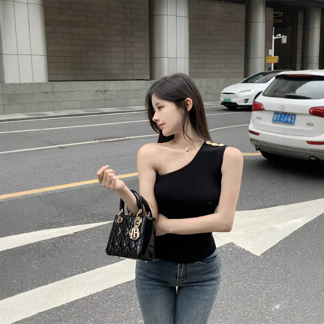 3156#黑色针织单肩吊带背心女夏辣妹露肩修身内搭不规则性感上衣