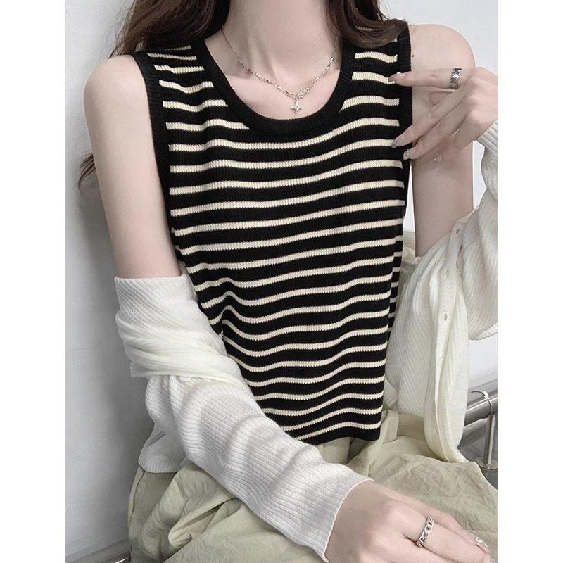 夏季新款法式条纹u型领冰丝薄款背心吊带女修身显瘦针织无袖上衣