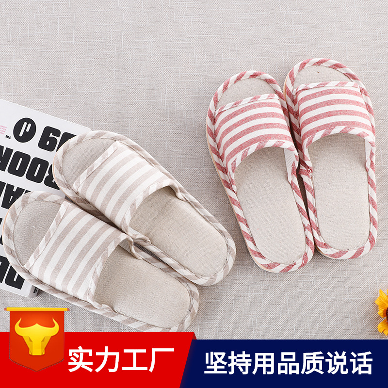 新款条纹居家酒店民宿男女情侣亚麻拖鞋四季厚底室内月子鞋