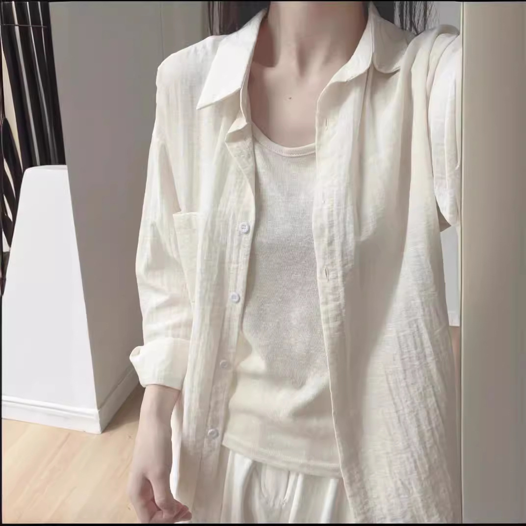 期待夏天~法式棉麻防晒衬衫女棉麻薄款衬衣高级感抗皱长袖两件套