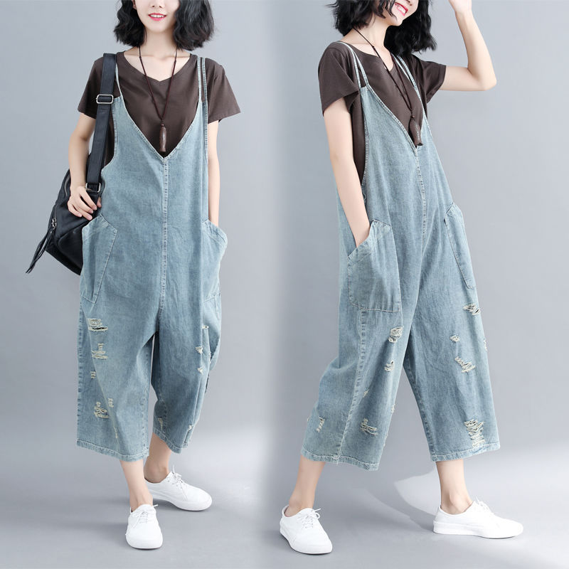 韩版加大码女裤胖mm春夏宽松显瘦文艺范阔腿破洞九分牛仔背带裤女
