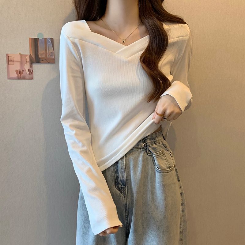 秋季新款穿搭V领打底衫内搭女设计感长袖T恤学生修身德绒上衣