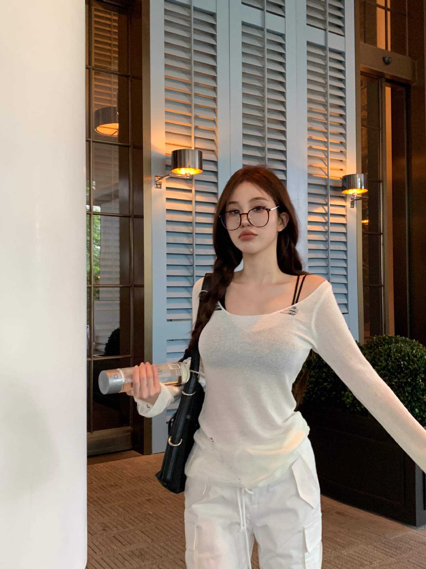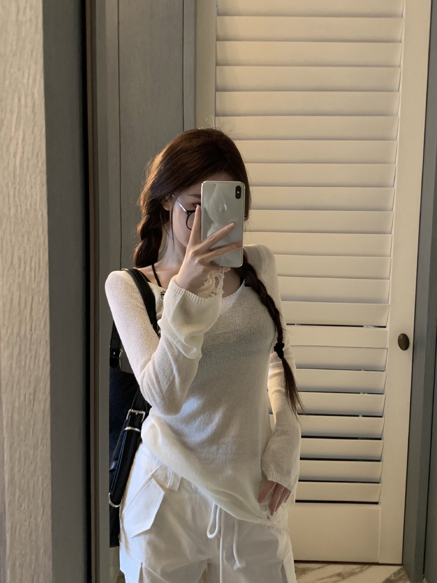 3766#韩系甜美长袖破洞针织T恤女装薄款防晒罩衫修身独特别致上衣