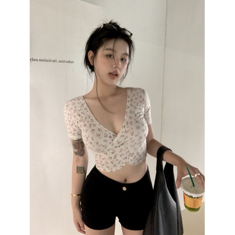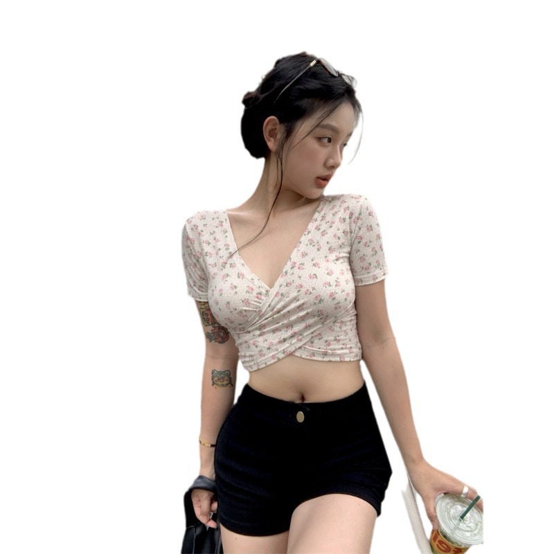 纯欲甜辣妹小碎花短袖T恤女夏季新款修身显瘦V领露脐短款上衣