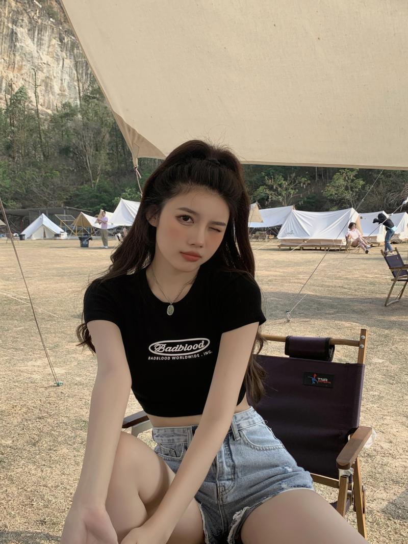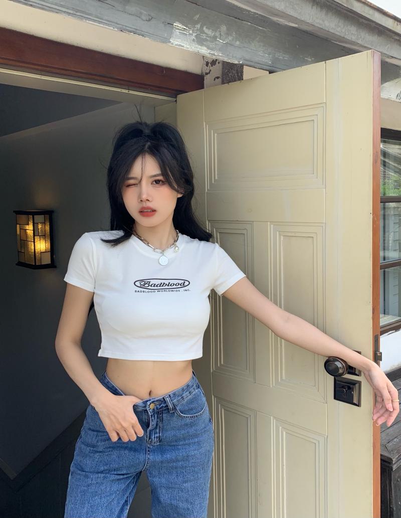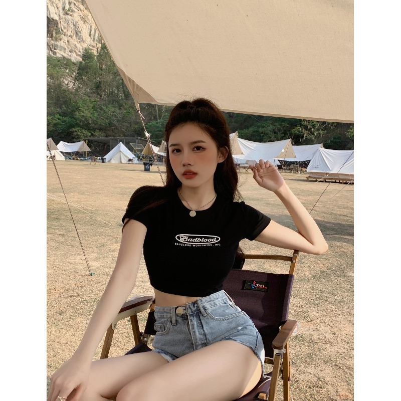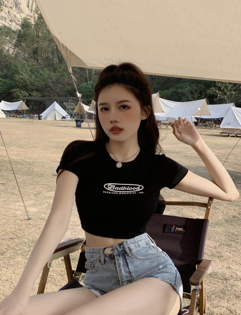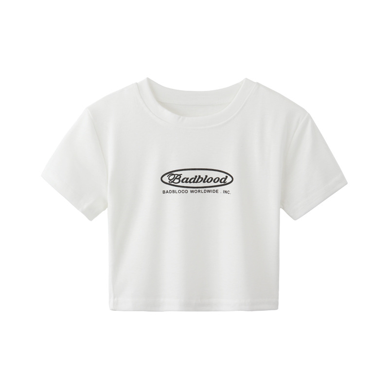 黑色字母印花短款T恤女年夏季新款修身显瘦百搭辣妹短袖上衣