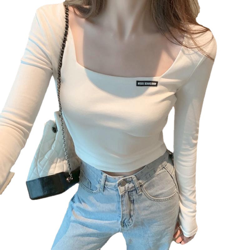 秋冬小众法式方领刺绣长袖T恤女百搭修身短款露脐打底衫紧身上衣t