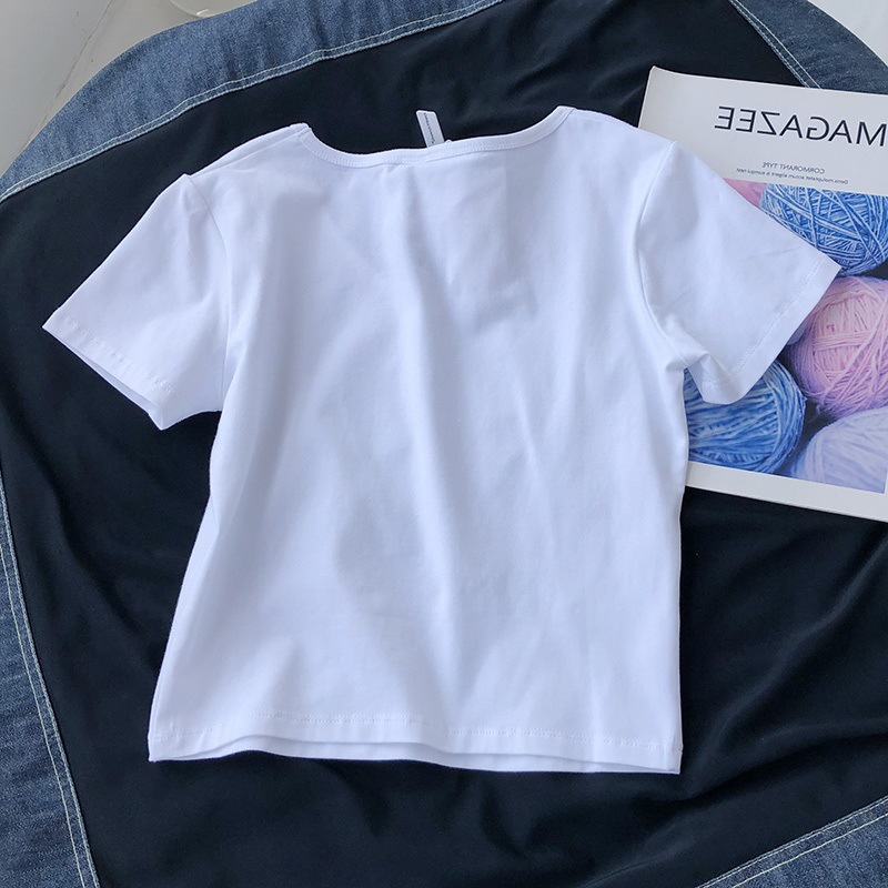 设计感V领抽绳修身纯欲风短袖T恤女装夏季新款纯色学生上衣潮