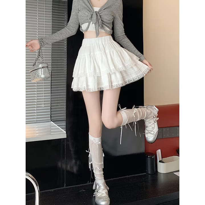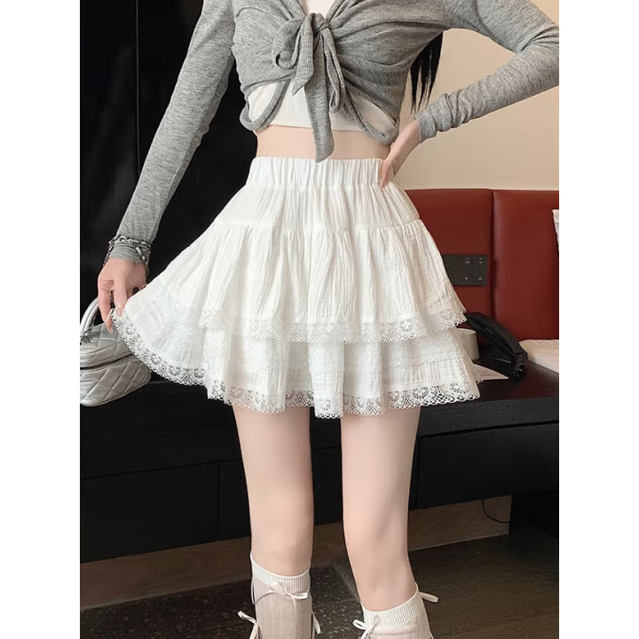 白色法式芭蕾风蓬蓬蛋糕裙女春夏季荷叶边短裙高腰a字蕾丝半身裙