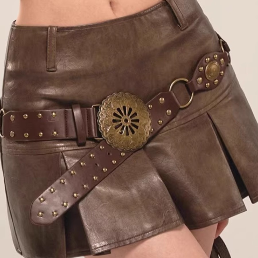 美式西部牛仔风铆钉腰带女复古vintage辣妹圆形腰封皮带