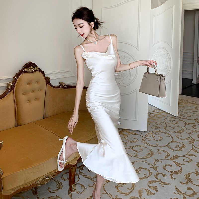 法式名媛吊带连衣裙女夏季高级感缎面荡领鱼尾裙立体花朵修身长裙