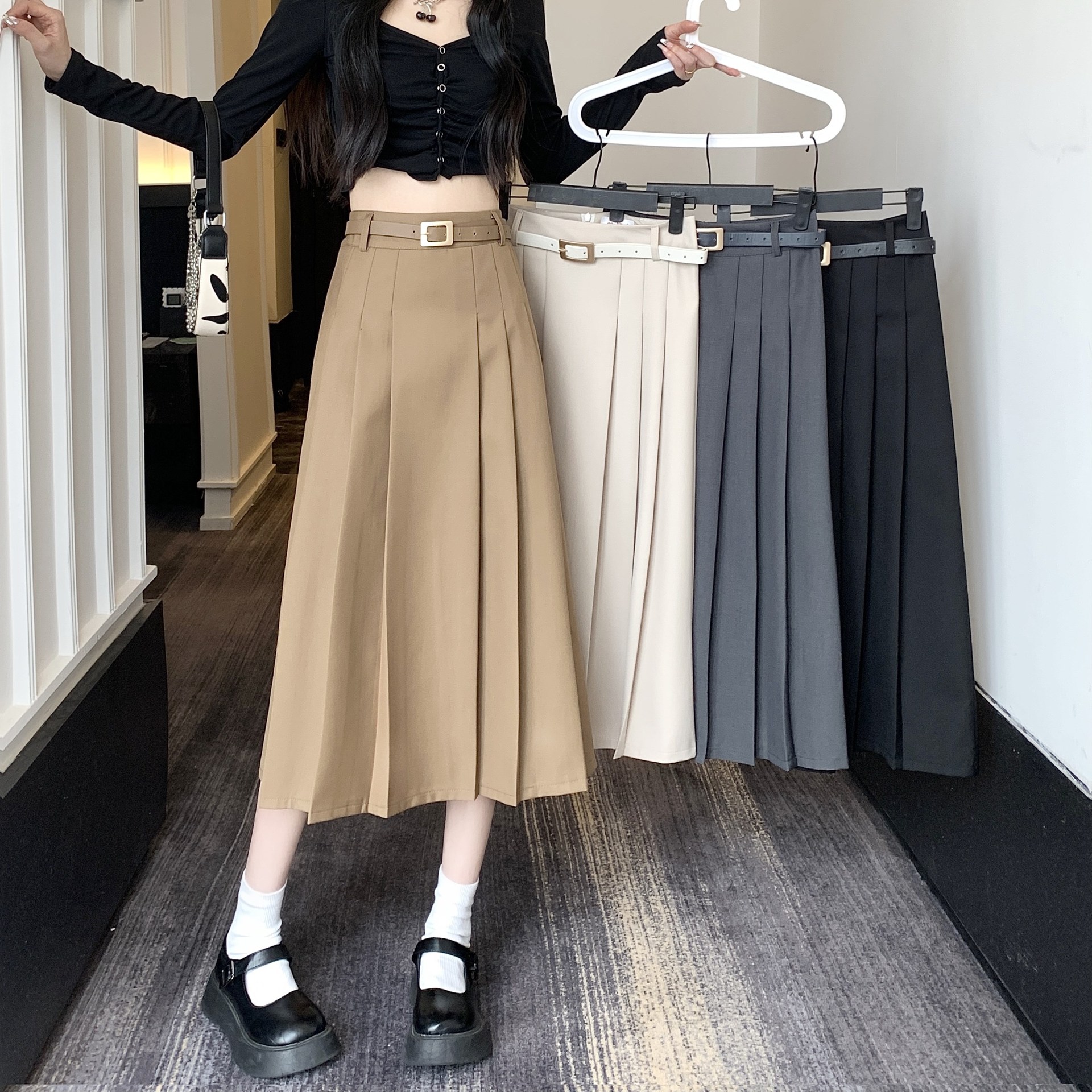 卡其色半身裙女春夏中长款a字显瘦高腰百褶裙半裙小个子包臀长裙