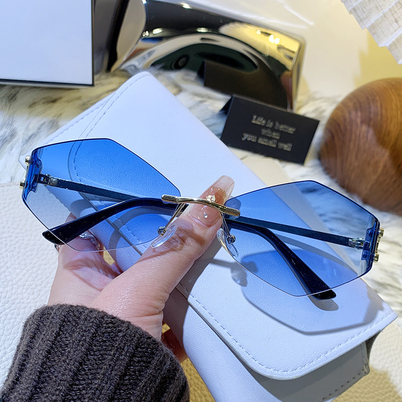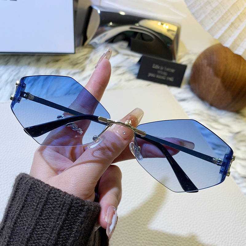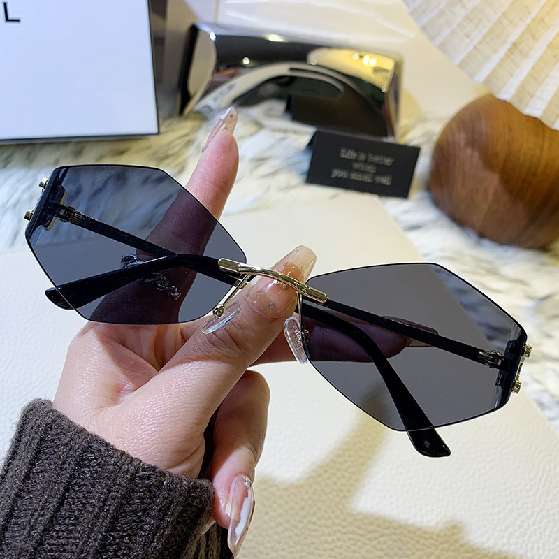 新款跨境弯曲镜片无框切边高级感女太阳镜欧美时尚多边形金属墨镜