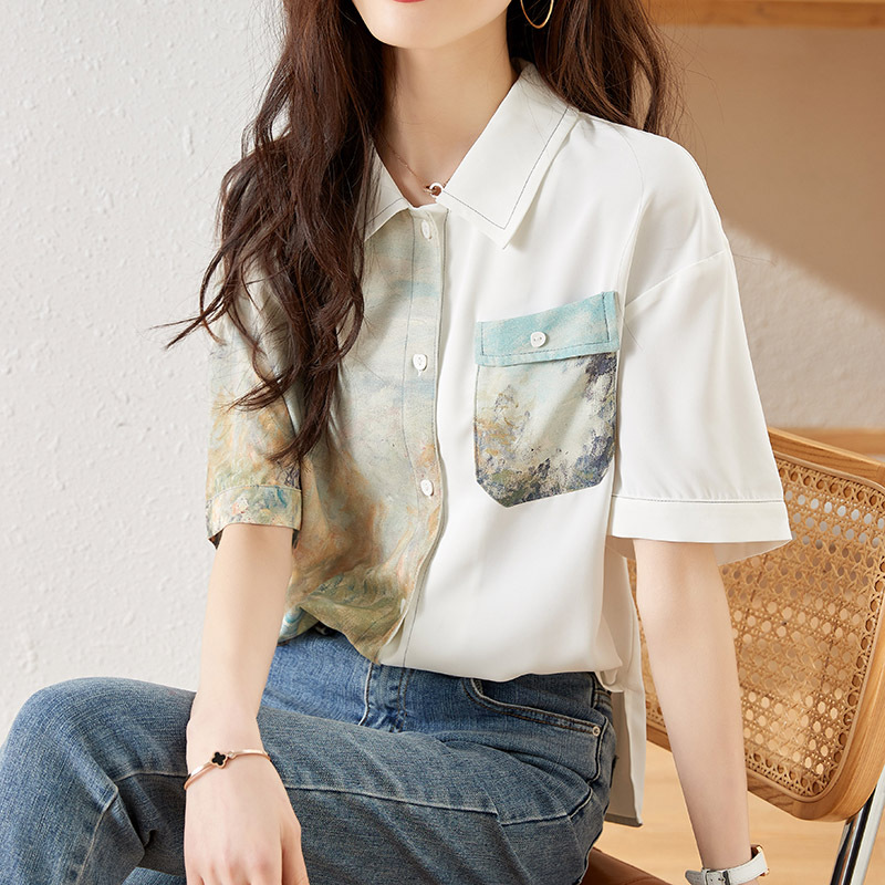 印花衬衫女慵懒风别致上衣女设计感小众时尚宽松短袖法式衬衣夏季