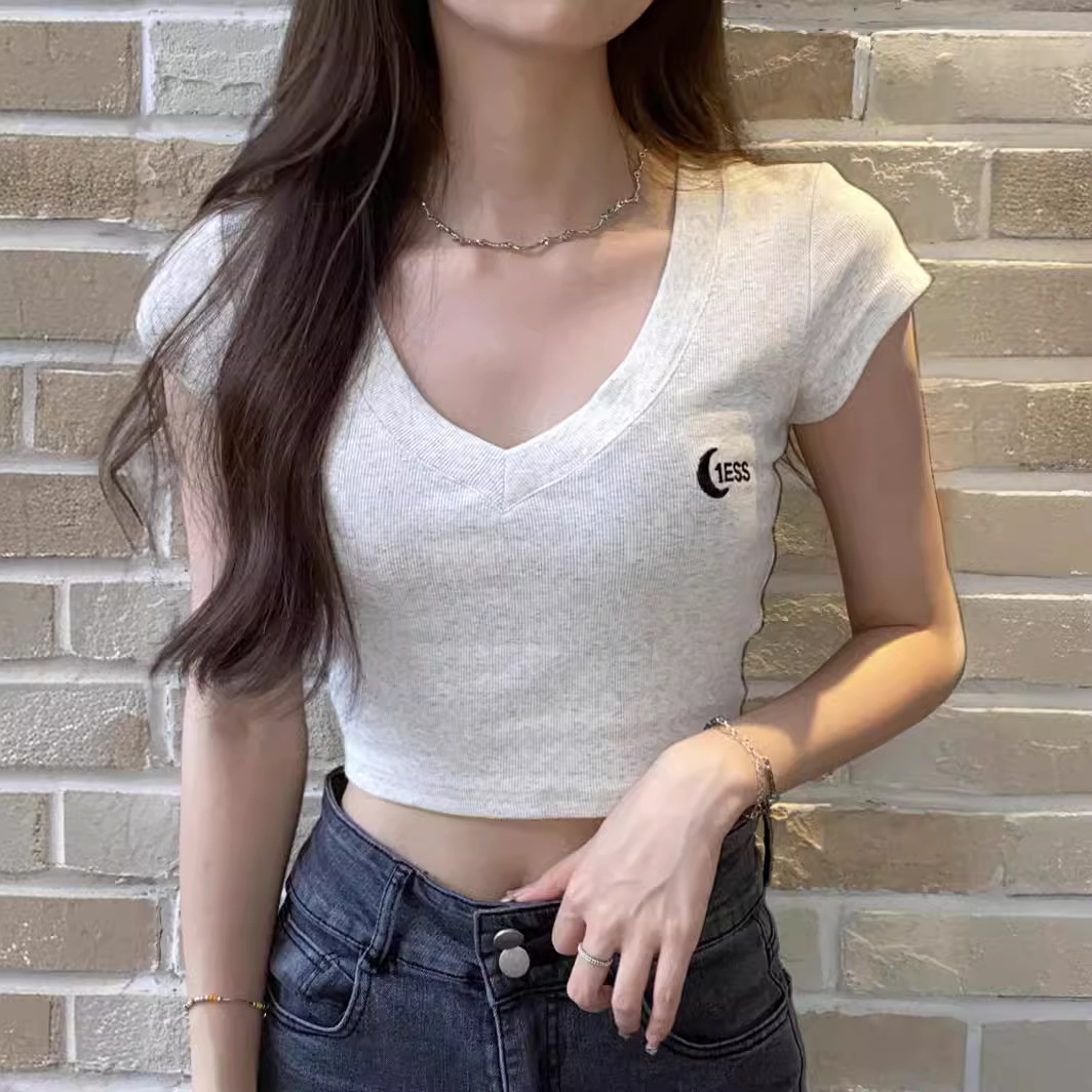V领绣花甜辣妹夏季新款短款莫代尔上衣短袖t恤女修身百搭显瘦高腰