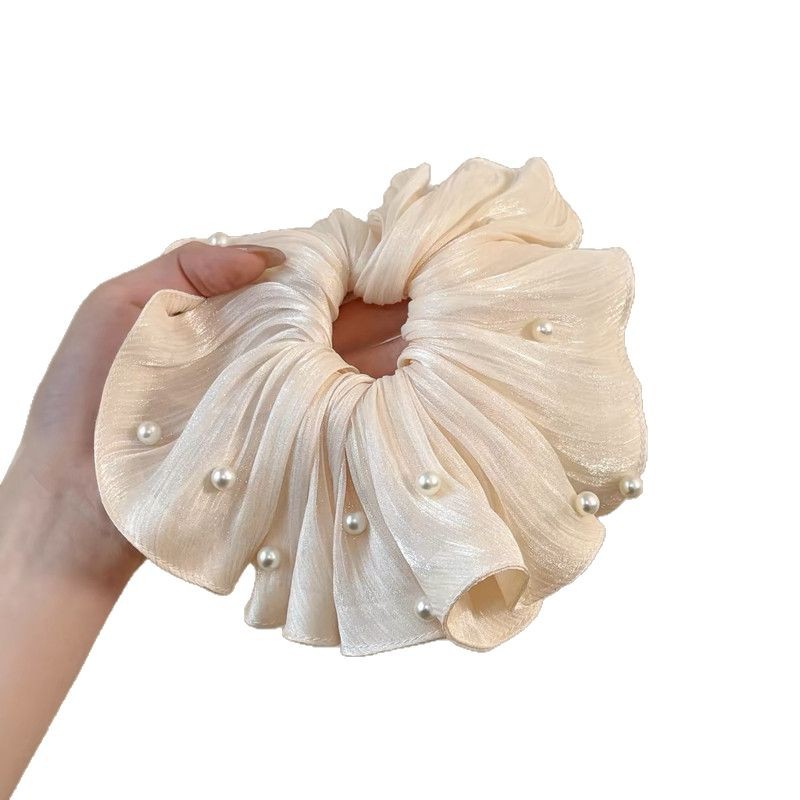 2025春季新款高级感流光丝滑锻面褶皱珍珠大肠发圈高端大号发饰女
