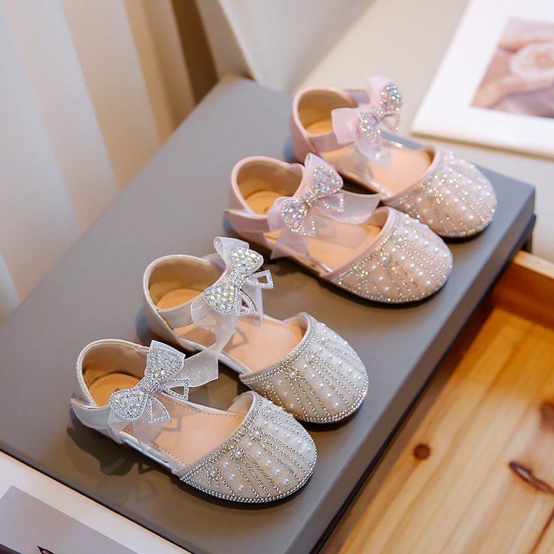 2025夏季甜美小皮鞋舞蹈鞋女童公主鞋圆头中空水钻蝴蝶结浅口单鞋