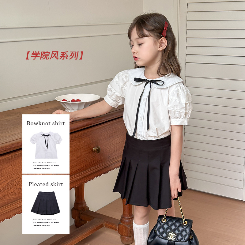 艾摩贝贝夏儿童学院风套装女童泡泡短袖蝴蝶结衬衫+百褶短裙2件套