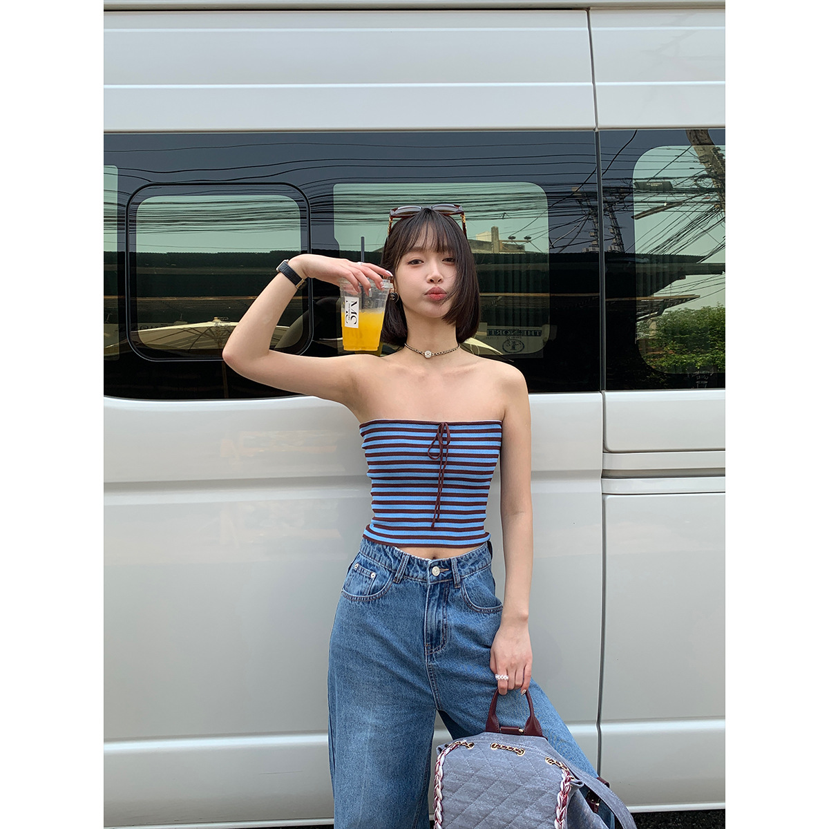 诠释美NEW OPEN一字肩上衣女夏季无袖短款系带条纹抹胸背心82377