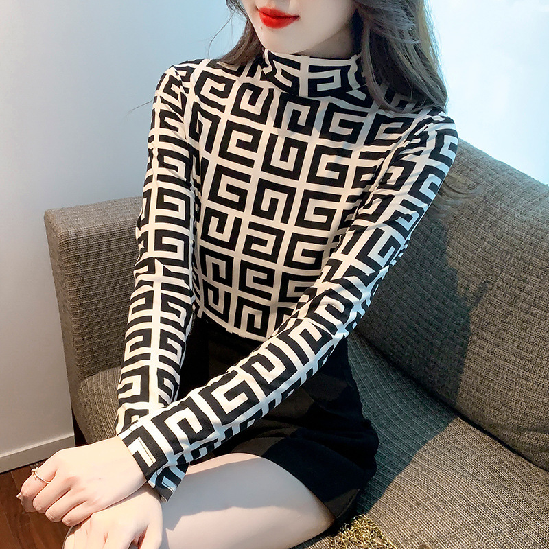 双面德绒半高领修身弹力印花打底衫女磨毛内搭长袖t恤打底小衫潮