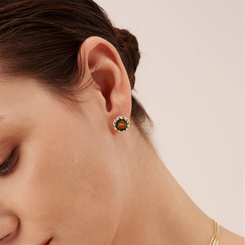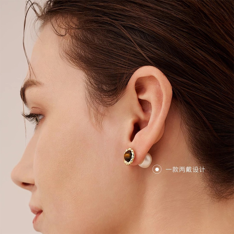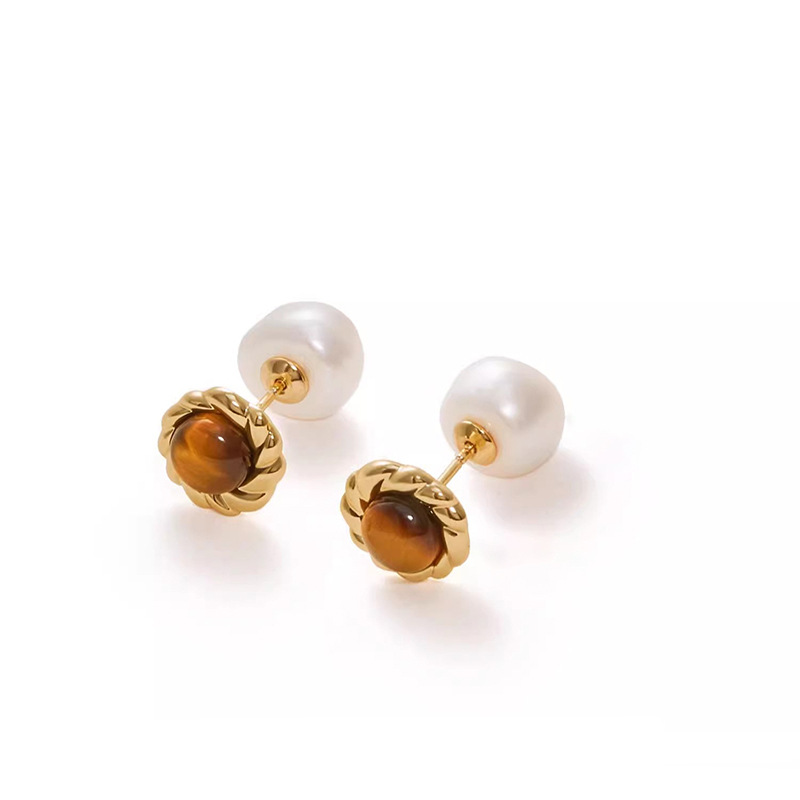 小红书爆款珍珠虎眼石焦糖咖啡耳钉2025新款双面佩戴耳饰一件代发