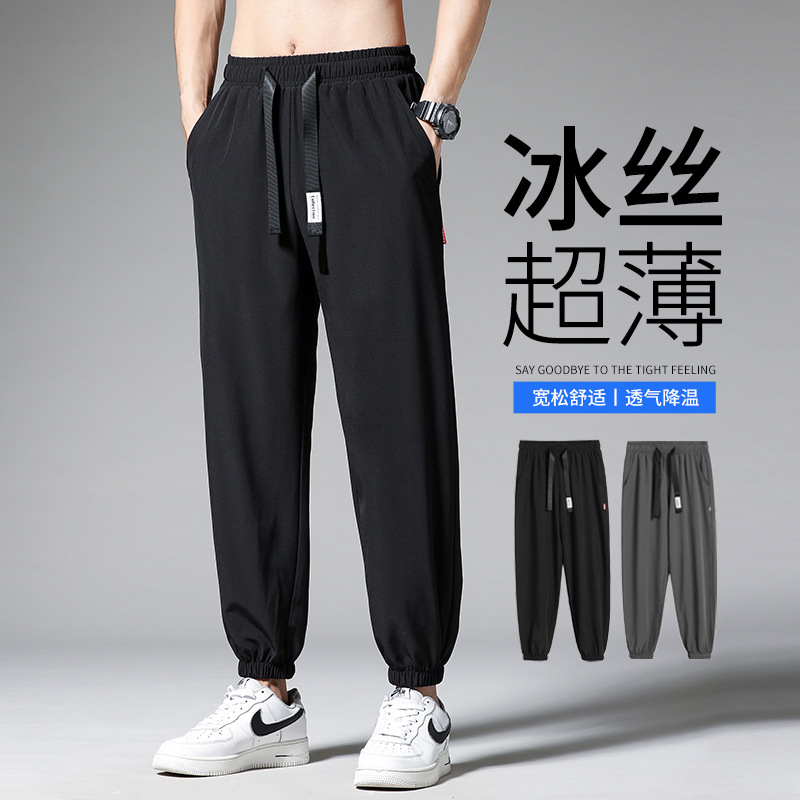 冰丝裤子男士夏季薄款潮牌高街宽松运动休闲长裤男生束脚黑色卫裤