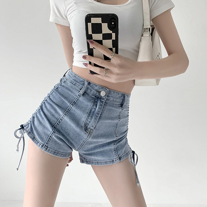 韩版百搭高腰牛仔短裤女夏抽绳设计感高腰显瘦小个子甜辣阔腿热裤