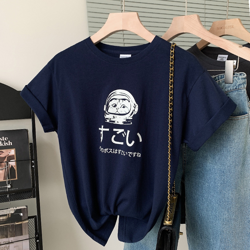 正肩纯棉短袖t恤女夏季薄款圆领内搭宽松白色上衣太空猫-YAS003