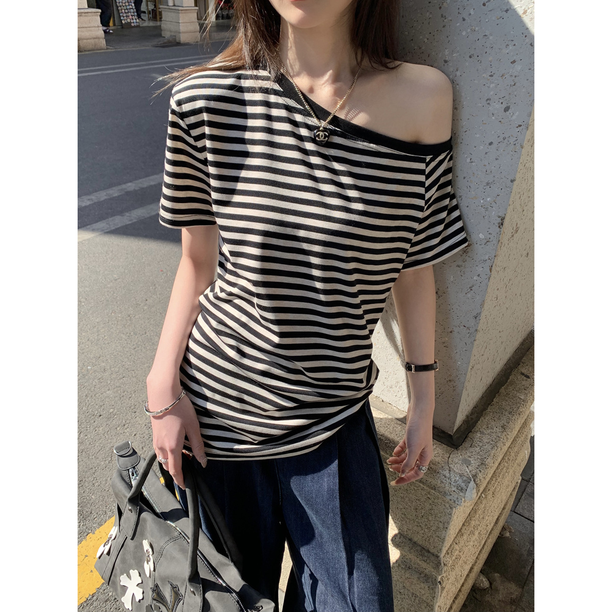 设计感斜肩短袖条纹T恤女2025夏季新款宽松显瘦百搭露肩学生上衣