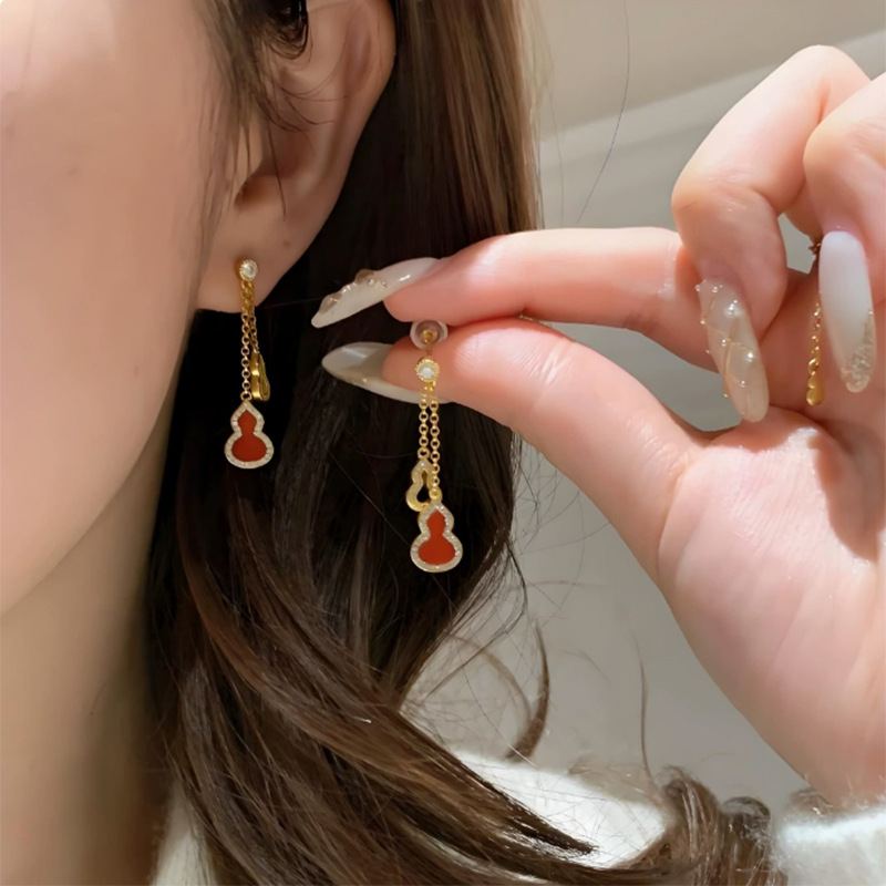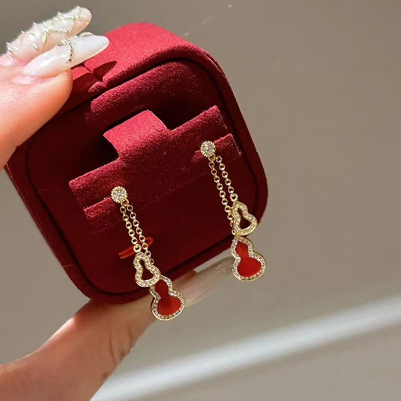小红书爆款红玛瑙闪钻葫芦耳钉2025新款气质国风红福禄镂空耳坠女