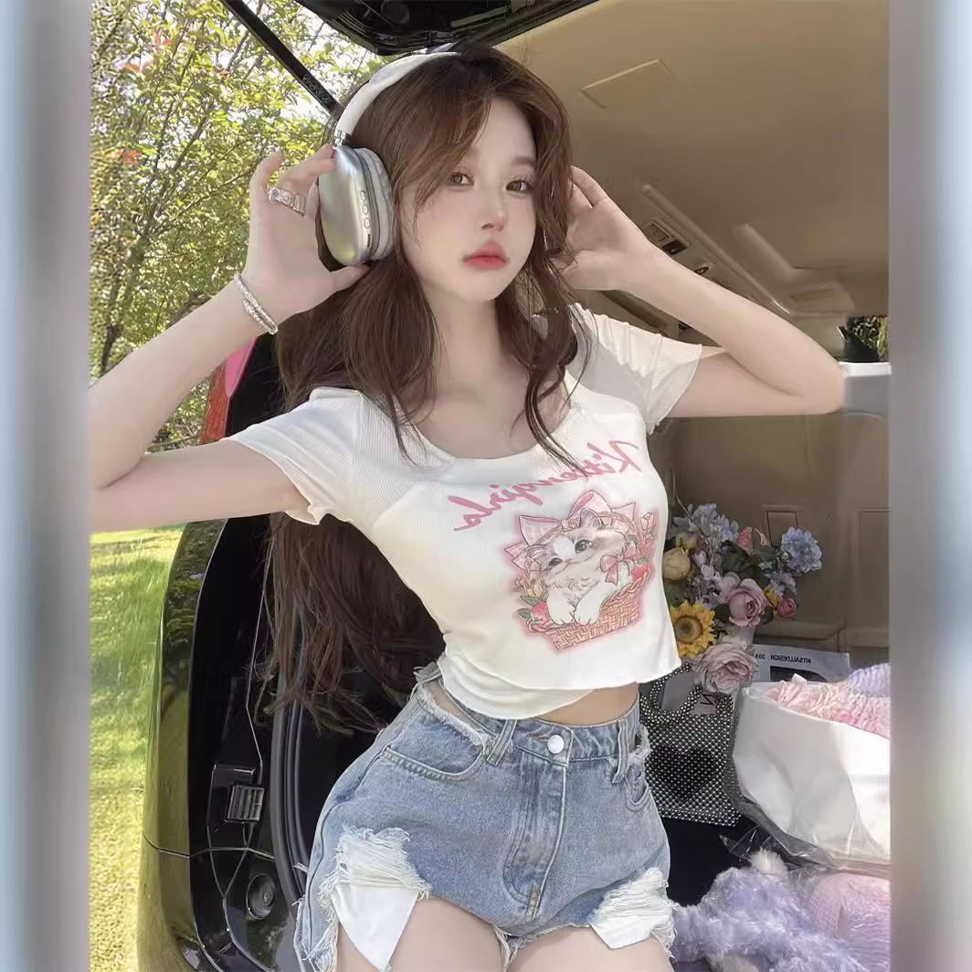 纯欲甜辣妹港味复古chic性感方领短款上衣设计感小众短袖t恤女夏
