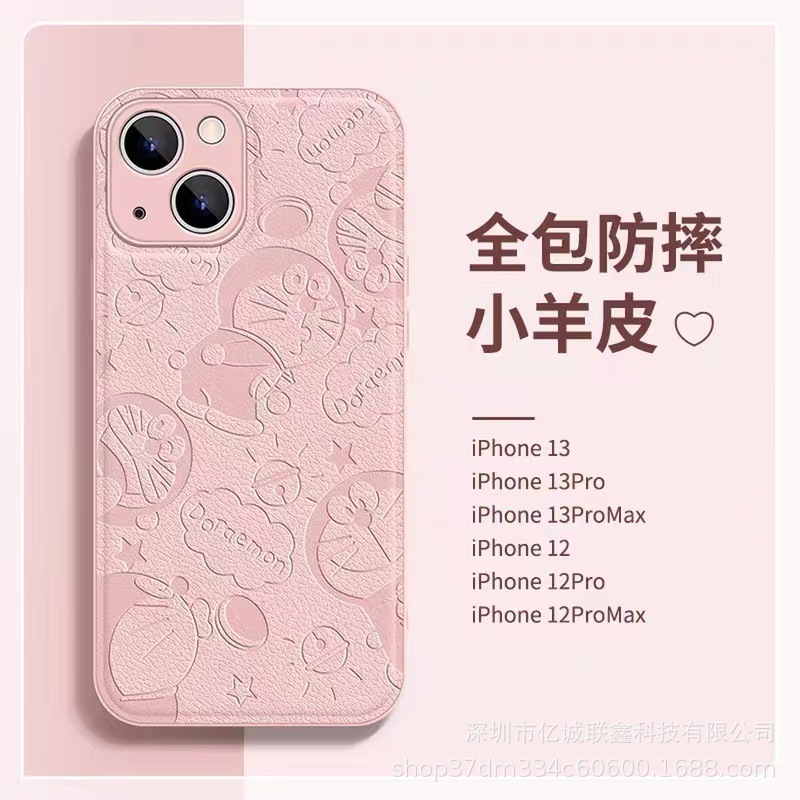 叮当猫适用苹果14手机壳iPhone15Promax全包镜头防摔11皮纹压印8p