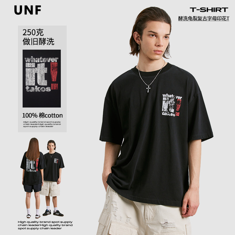 UNF春夏新款250克酵洗做旧撕裂字母印花T恤宽松潮牌上衣中性