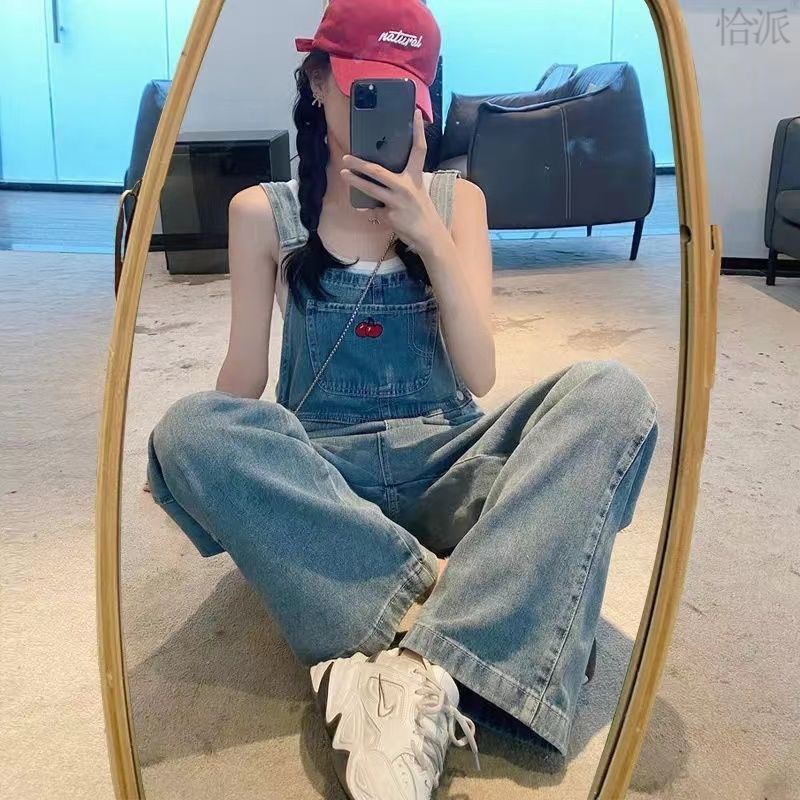 樱桃刺绣牛仔背带裤女春夏新款直筒宽松裤子减龄显瘦小个子