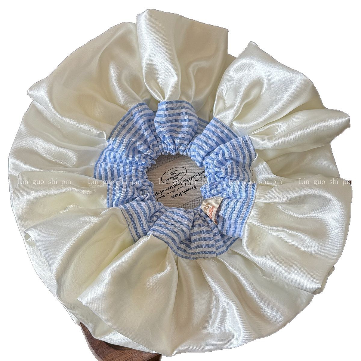 超大奶油缎面褶皱花边头花发圈芭蕾风蓝条纹大肠圈甜美高级感发绳